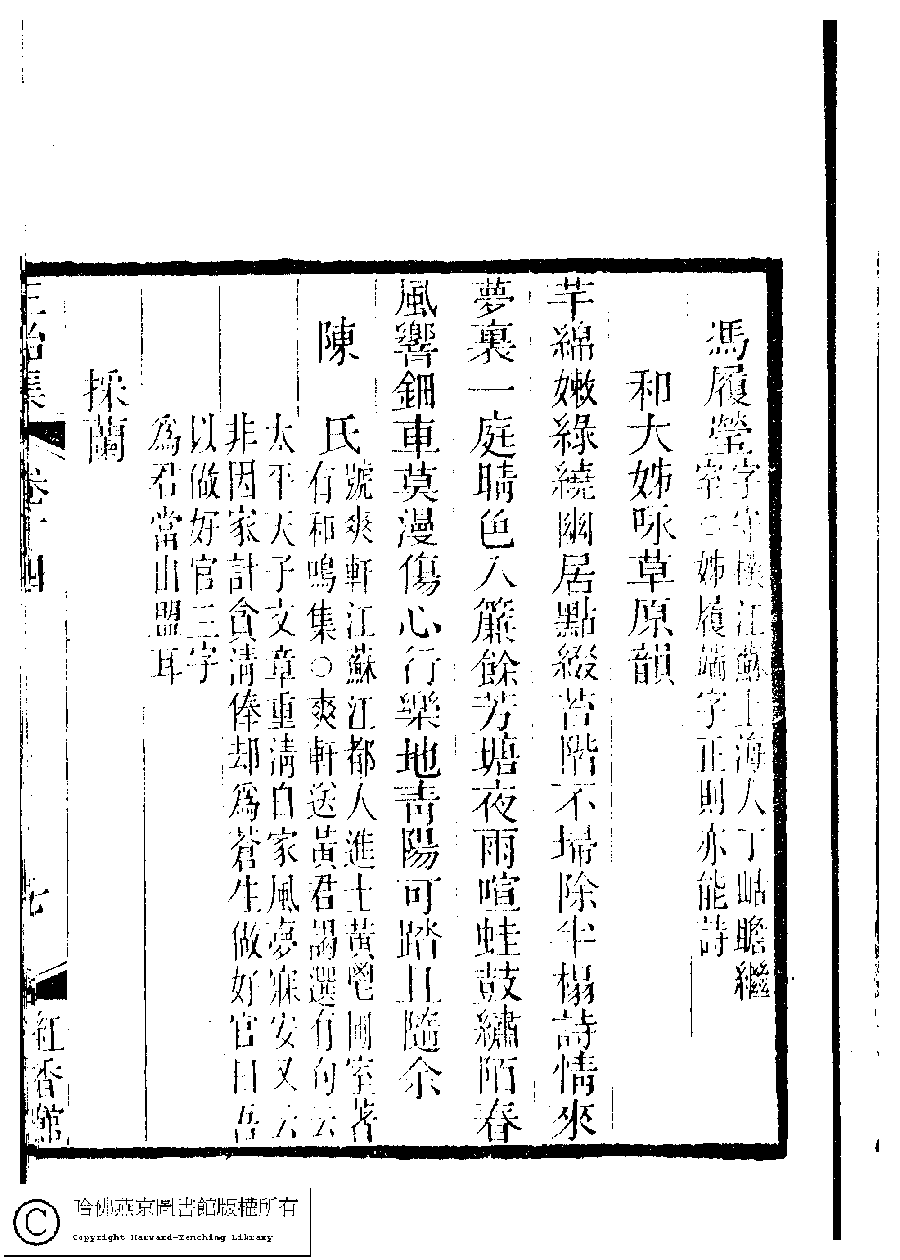 | (PRINT FRIENDLY VERSION) 國朝閨秀正始集﹕二十卷﹐附錄﹕一卷﹐補遺﹕一卷﹐又附題詞﹕一卷(清惲珠輯)。清道光十一年(1831)紅香館刻本。 ![]() Page : 14.7a | click for larger image | Back |