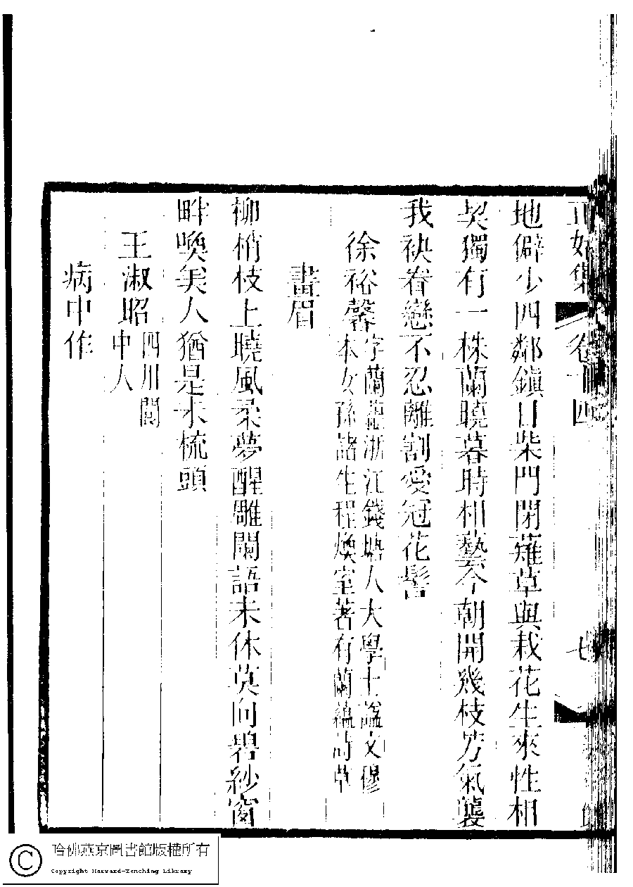 | (PRINT FRIENDLY VERSION) 國朝閨秀正始集﹕二十卷﹐附錄﹕一卷﹐補遺﹕一卷﹐又附題詞﹕一卷(清惲珠輯)。清道光十一年(1831)紅香館刻本。 ![]() Page : 14.7b | click for larger image | Back |