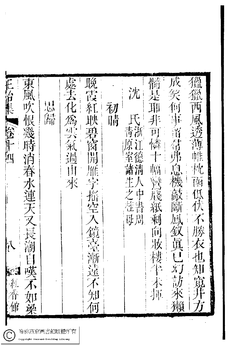 | (PRINT FRIENDLY VERSION) 國朝閨秀正始集﹕二十卷﹐附錄﹕一卷﹐補遺﹕一卷﹐又附題詞﹕一卷(清惲珠輯)。清道光十一年(1831)紅香館刻本。 ![]() Page : 14.8a | click for larger image | Back |