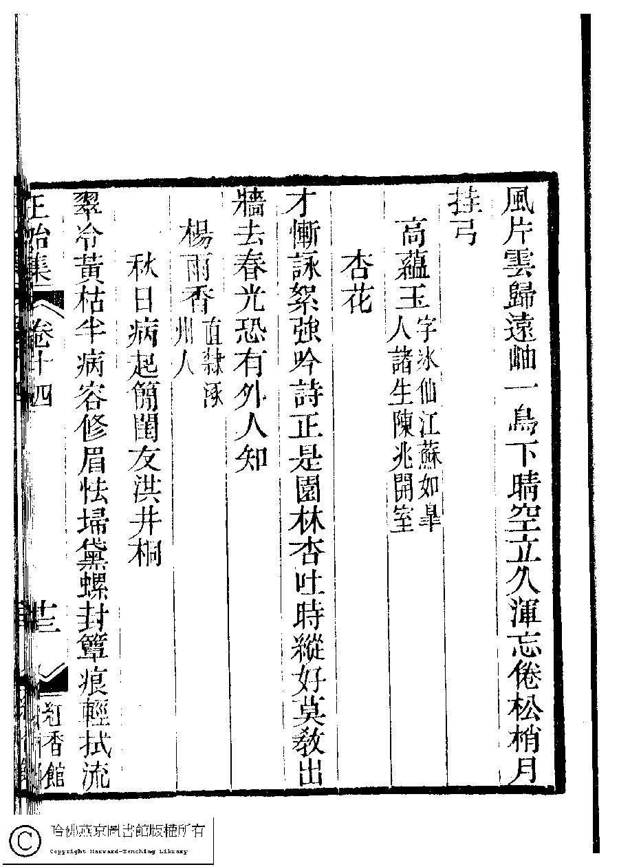 | (PRINT FRIENDLY VERSION) 國朝閨秀正始集﹕二十卷﹐附錄﹕一卷﹐補遺﹕一卷﹐又附題詞﹕一卷(清惲珠輯)。清道光十一年(1831)紅香館刻本。 ![]() Page : 14.13a | click for larger image | Back |