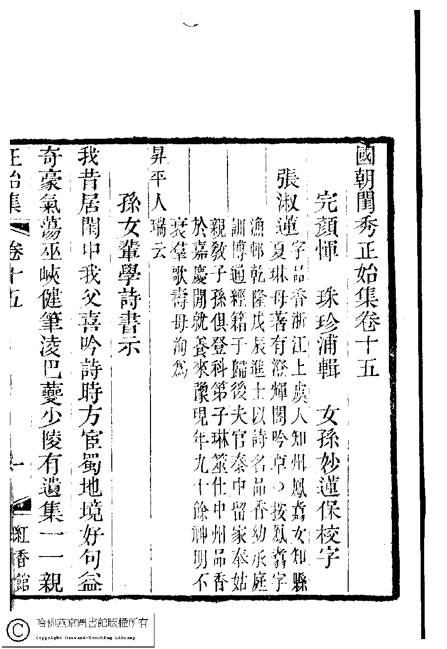 | (PRINT FRIENDLY VERSION) 國朝閨秀正始集﹕二十卷﹐附錄﹕一卷﹐補遺﹕一卷﹐又附題詞﹕一卷(清惲珠輯)。清道光十一年(1831)紅香館刻本。 ![]() Page : 15.1a | click for larger image | Back |