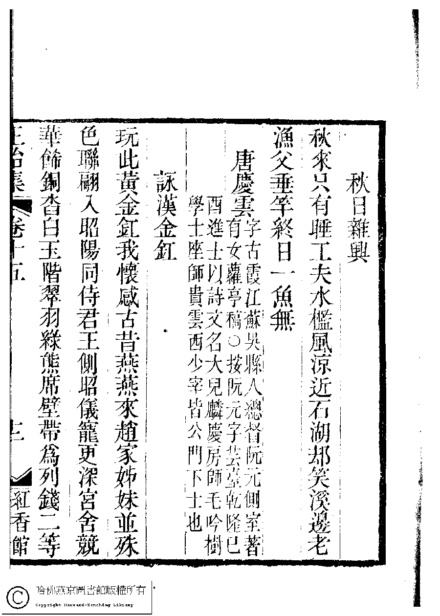 | (PRINT FRIENDLY VERSION) 國朝閨秀正始集﹕二十卷﹐附錄﹕一卷﹐補遺﹕一卷﹐又附題詞﹕一卷(清惲珠輯)。清道光十一年(1831)紅香館刻本。 ![]() Page : 15.12a | click for larger image | Back |