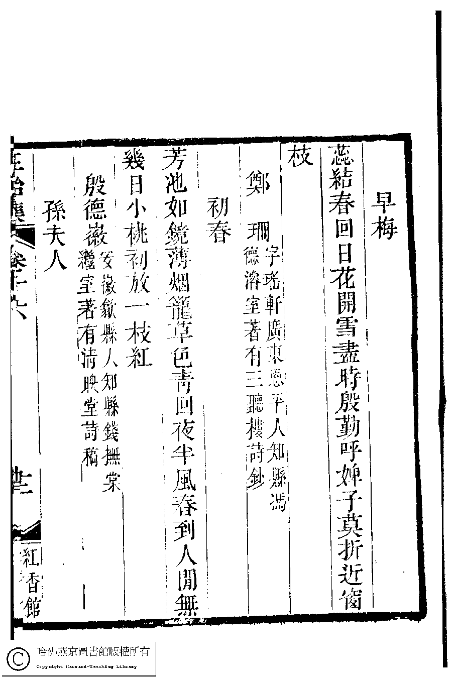 | (PRINT FRIENDLY VERSION) 國朝閨秀正始集﹕二十卷﹐附錄﹕一卷﹐補遺﹕一卷﹐又附題詞﹕一卷(清惲珠輯)。清道光十一年(1831)紅香館刻本。 ![]() Page : 16.12a | click for larger image | Back |