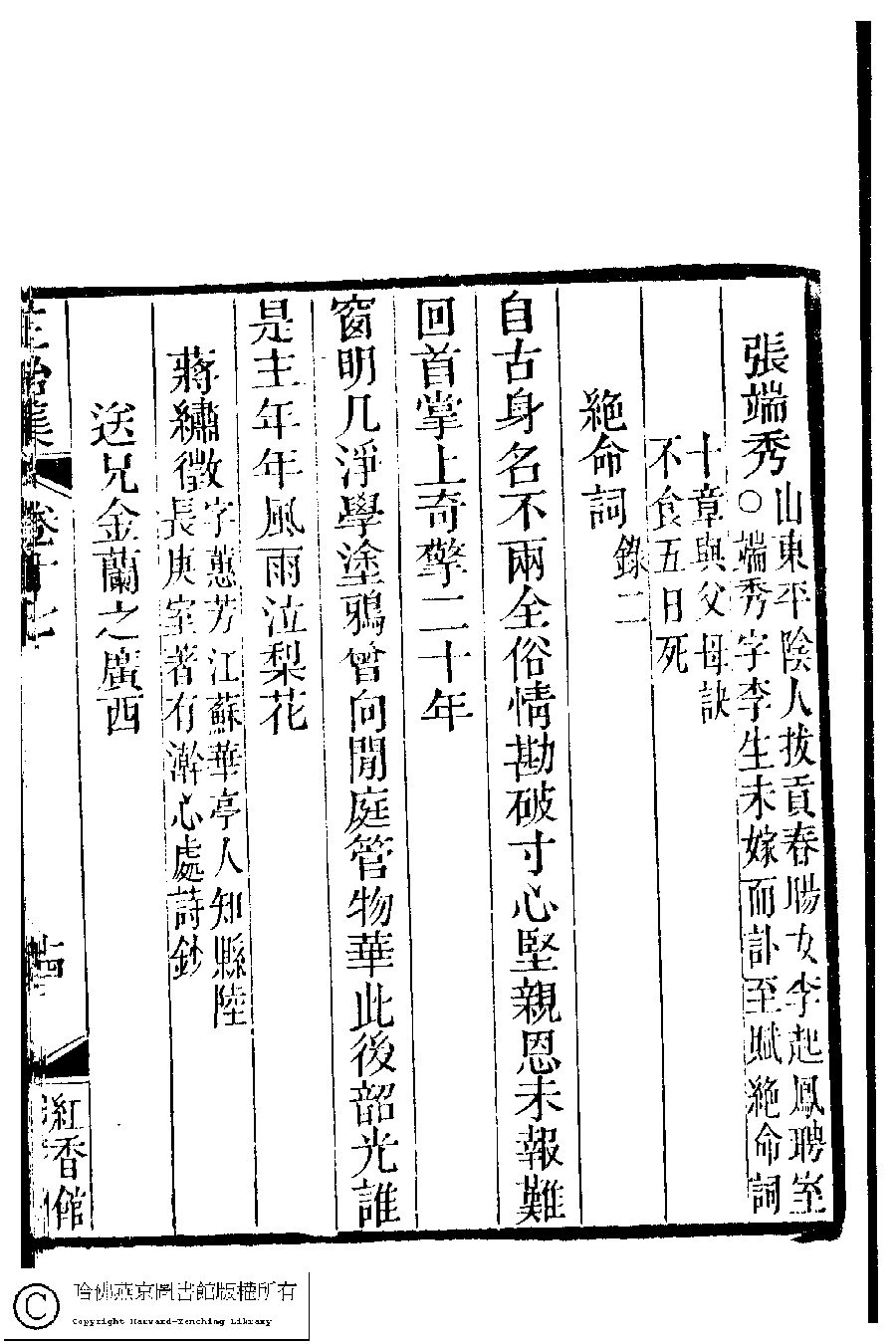 | (PRINT FRIENDLY VERSION) 國朝閨秀正始集﹕二十卷﹐附錄﹕一卷﹐補遺﹕一卷﹐又附題詞﹕一卷(清惲珠輯)。清道光十一年(1831)紅香館刻本。 ![]() Page : 17.14a | click for larger image | Back |