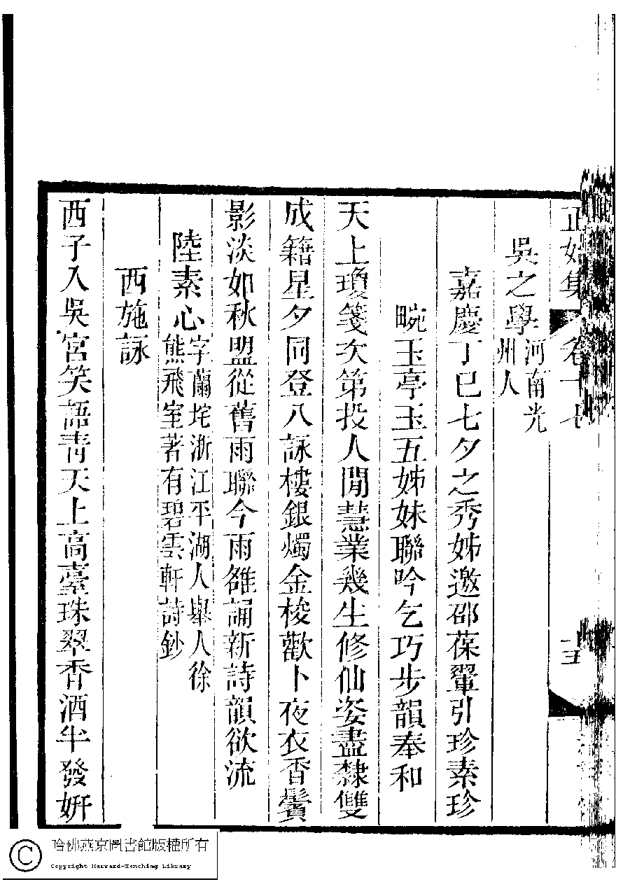 | (PRINT FRIENDLY VERSION) 國朝閨秀正始集﹕二十卷﹐附錄﹕一卷﹐補遺﹕一卷﹐又附題詞﹕一卷(清惲珠輯)。清道光十一年(1831)紅香館刻本。 ![]() Page : 17.15b | click for larger image | Back |