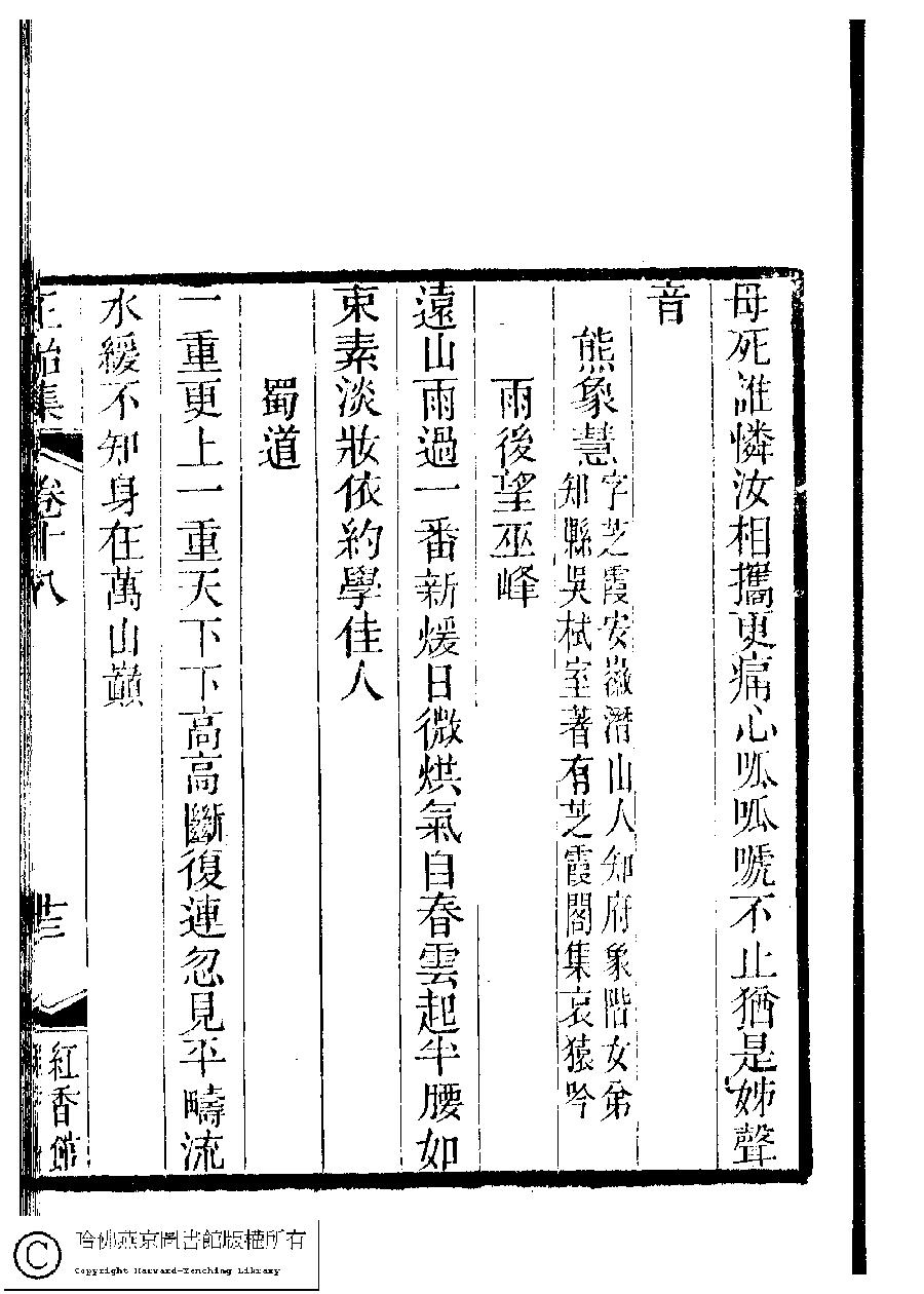 | (PRINT FRIENDLY VERSION) 國朝閨秀正始集﹕二十卷﹐附錄﹕一卷﹐補遺﹕一卷﹐又附題詞﹕一卷(清惲珠輯)。清道光十一年(1831)紅香館刻本。 ![]() Page : 18.13a | click for larger image | Back |