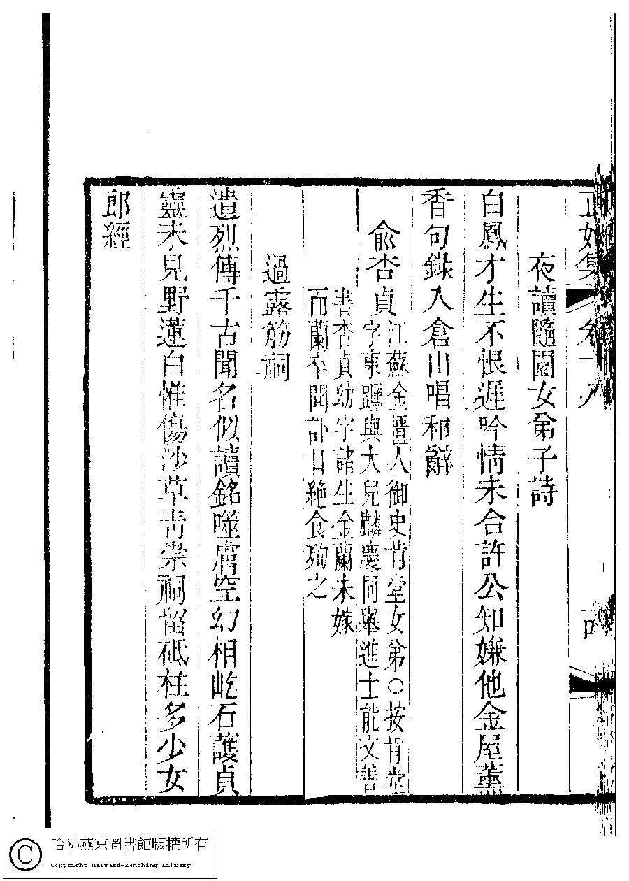 | (PRINT FRIENDLY VERSION) 國朝閨秀正始集﹕二十卷﹐附錄﹕一卷﹐補遺﹕一卷﹐又附題詞﹕一卷(清惲珠輯)。清道光十一年(1831)紅香館刻本。 ![]() Page : 18.14b | click for larger image | Back |