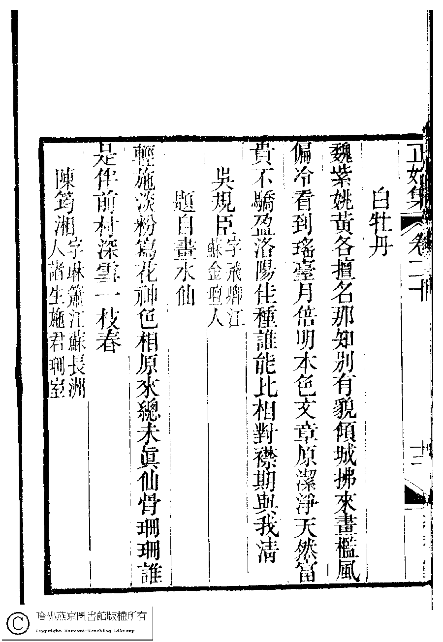 | (PRINT FRIENDLY VERSION) 國朝閨秀正始集﹕二十卷﹐附錄﹕一卷﹐補遺﹕一卷﹐又附題詞﹕一卷(清惲珠輯)。清道光十一年(1831)紅香館刻本。 ![]() Page : 20.12b | click for larger image | Back |