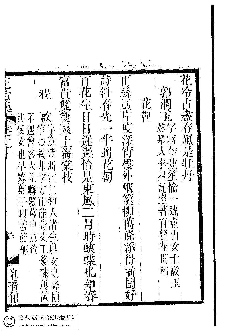 | (PRINT FRIENDLY VERSION) 國朝閨秀正始集﹕二十卷﹐附錄﹕一卷﹐補遺﹕一卷﹐又附題詞﹕一卷(清惲珠輯)。清道光十一年(1831)紅香館刻本。 ![]() Page : 20.20a | click for larger image | Back |