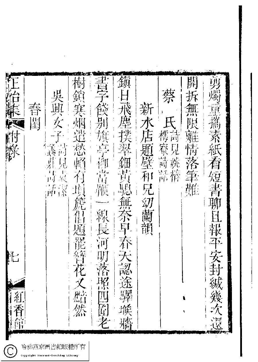 | (PRINT FRIENDLY VERSION) 國朝閨秀正始集﹕二十卷﹐附錄﹕一卷﹐補遺﹕一卷﹐又附題詞﹕一卷(清惲珠輯)。清道光十一年(1831)紅香館刻本。 ![]() Page : 附錄.7a | click for larger image | Back |