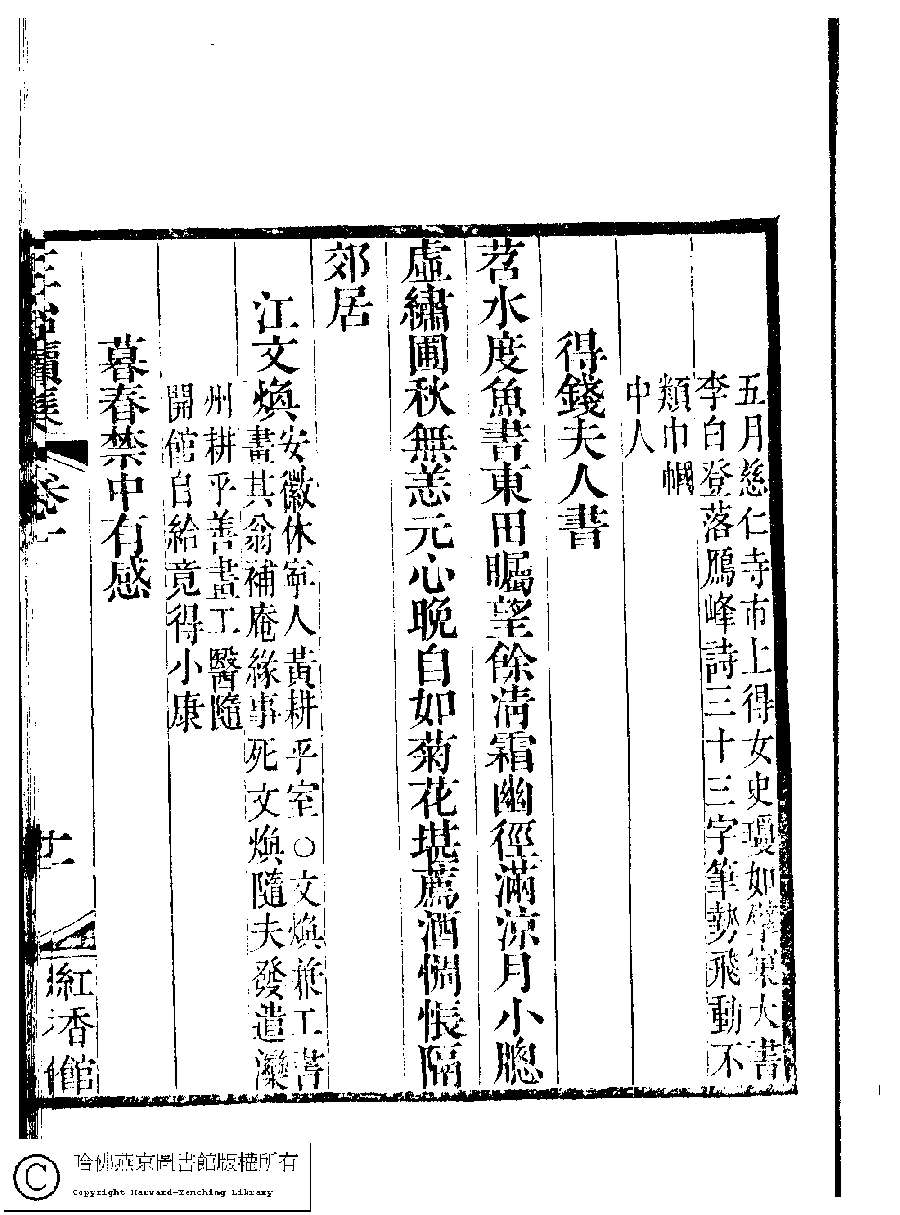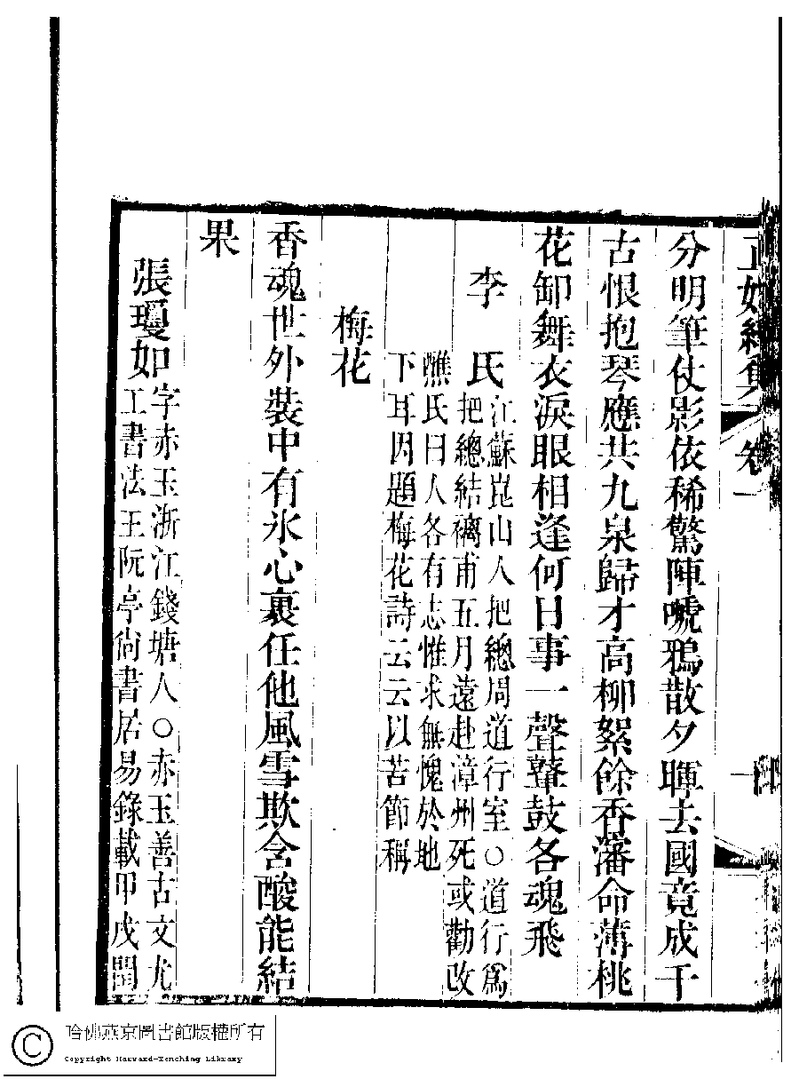| (PRINT FRIENDLY VERSION) 國朝閨秀正始續集﹕十卷﹐附錄﹕一卷﹐補遺﹕一卷﹐輓詞﹕一卷(清惲珠輯)。清道光十六年(1836)紅香館刻本。 ![]() Page : 1.11a | click for larger image | 國朝閨秀正始續集﹕十卷﹐附錄﹕一卷﹐補遺﹕一卷﹐輓詞﹕一卷(清惲珠輯)。清道光十六年(1836)紅香館刻本。![]() Page : 1.10b | click for larger image | Back |