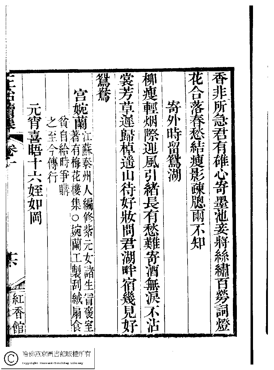 | (PRINT FRIENDLY VERSION) 國朝閨秀正始續集﹕十卷﹐附錄﹕一卷﹐補遺﹕一卷﹐輓詞﹕一卷(清惲珠輯)。清道光十六年(1836)紅香館刻本。 ![]() Page : 1.16a | click for larger image | Back |