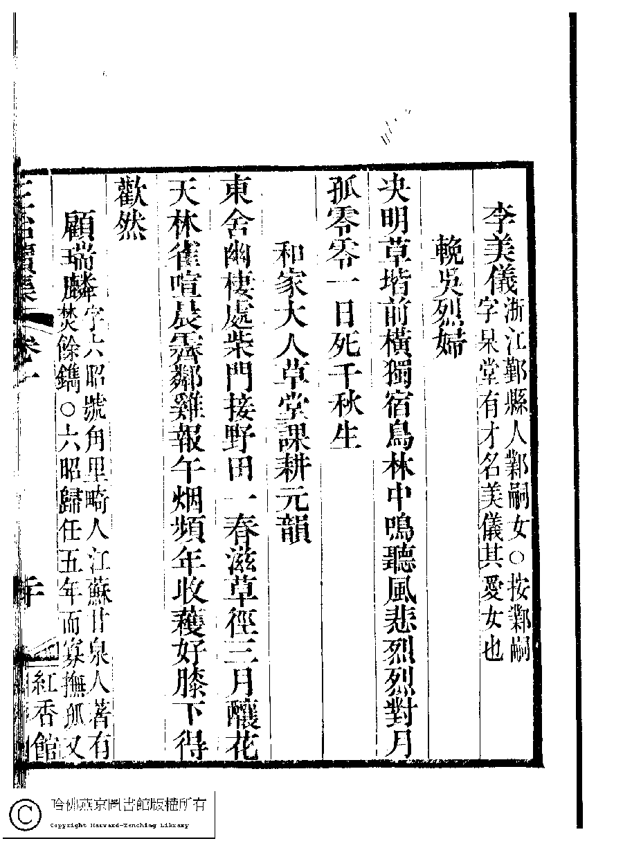 | (PRINT FRIENDLY VERSION) 國朝閨秀正始續集﹕十卷﹐附錄﹕一卷﹐補遺﹕一卷﹐輓詞﹕一卷(清惲珠輯)。清道光十六年(1836)紅香館刻本。 ![]() Page : 1.20b | click for larger image | 國朝閨秀正始續集﹕十卷﹐附錄﹕一卷﹐補遺﹕一卷﹐輓詞﹕一卷(清惲珠輯)。清道光十六年(1836)紅香館刻本。![]() Page : 1.20a | click for larger image | Back |