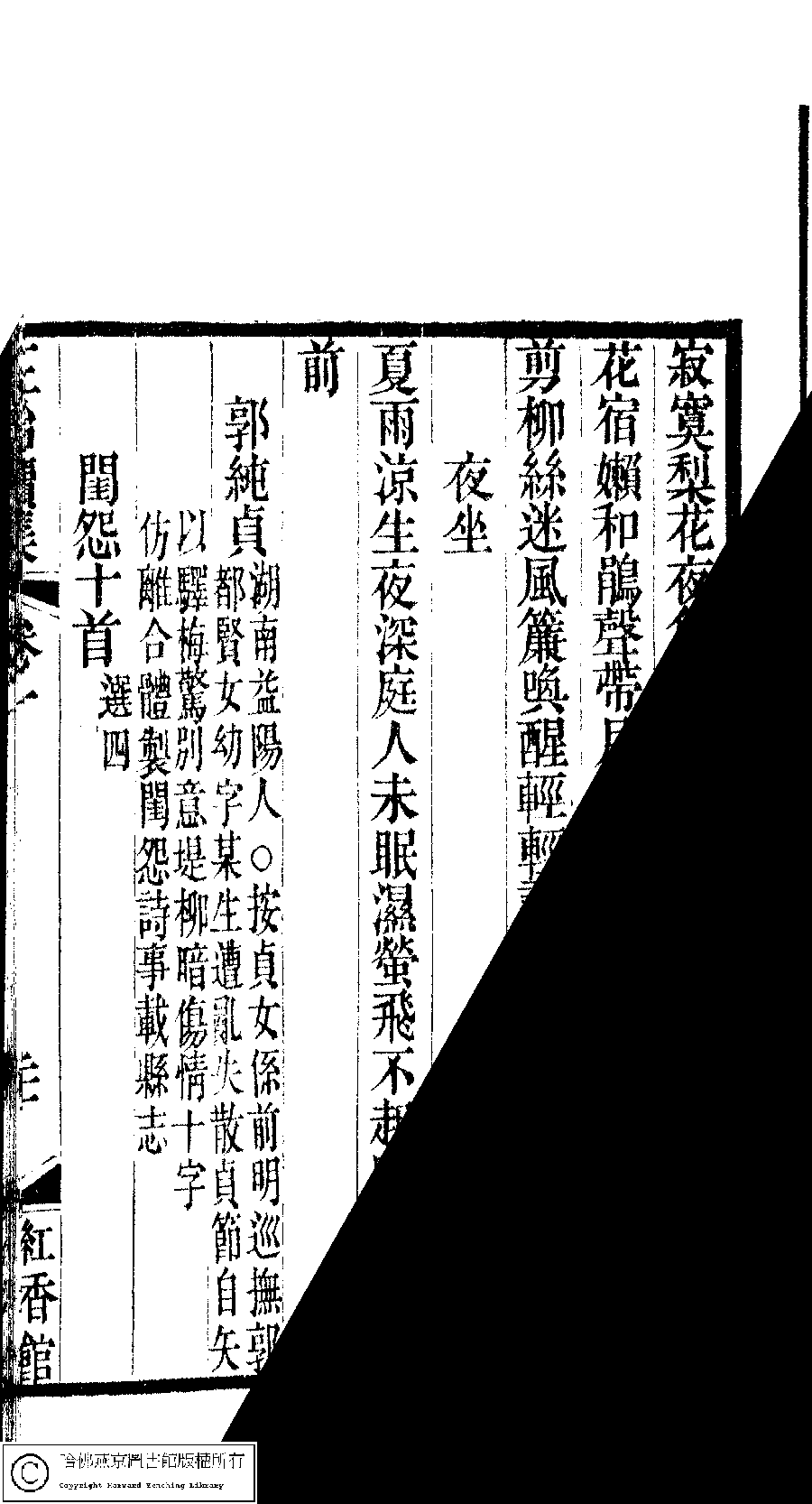 | (PRINT FRIENDLY VERSION) 國朝閨秀正始續集﹕十卷﹐附錄﹕一卷﹐補遺﹕一卷﹐輓詞﹕一卷(清惲珠輯)。清道光十六年(1836)紅香館刻本。 ![]() Page : 1.21a | click for larger image | Back |