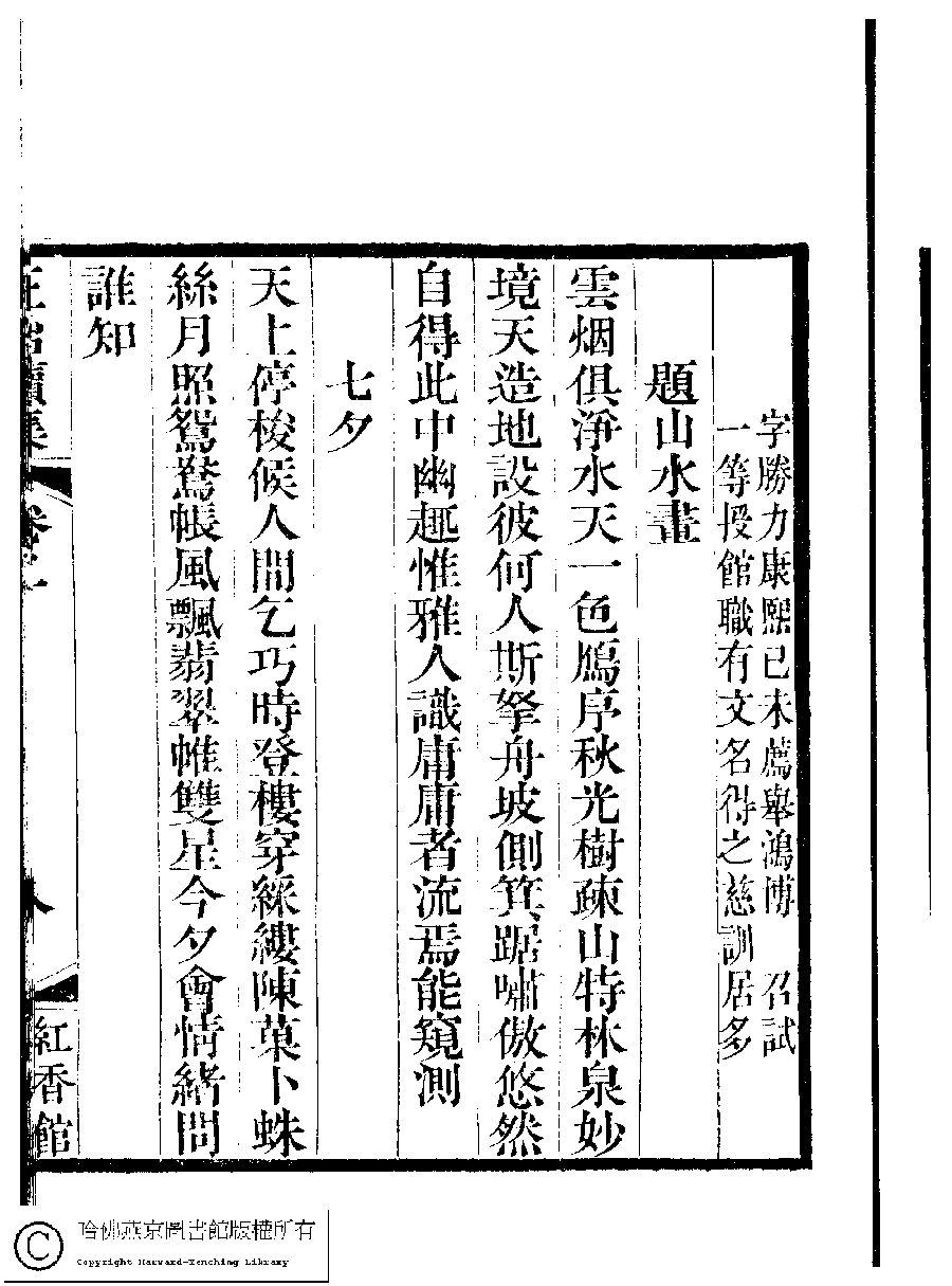 | (PRINT FRIENDLY VERSION) 國朝閨秀正始續集﹕十卷﹐附錄﹕一卷﹐補遺﹕一卷﹐輓詞﹕一卷(清惲珠輯)。清道光十六年(1836)紅香館刻本。 ![]() Page : 2.8a | click for larger image | 國朝閨秀正始續集﹕十卷﹐附錄﹕一卷﹐補遺﹕一卷﹐輓詞﹕一卷(清惲珠輯)。清道光十六年(1836)紅香館刻本。![]() Page : 2.7b | click for larger image | Back |