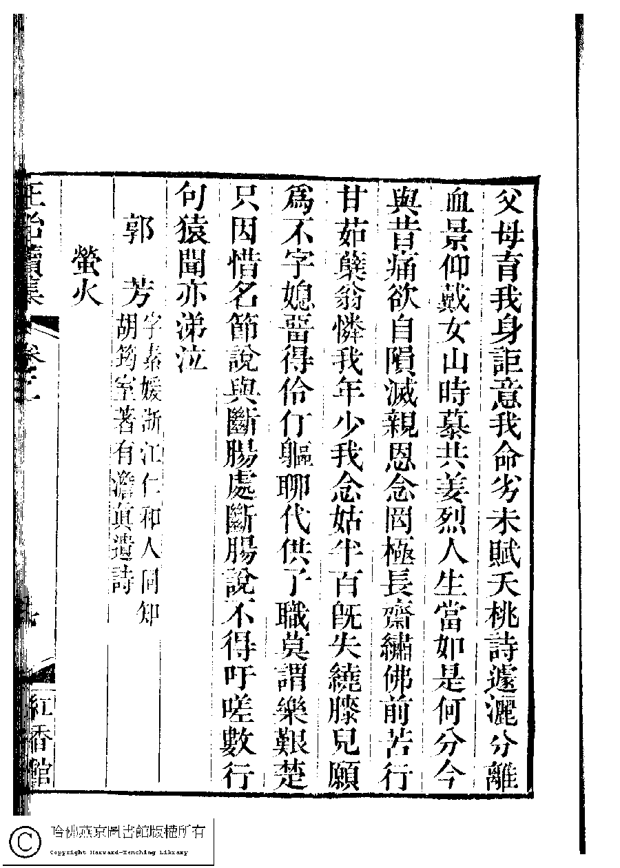 | (PRINT FRIENDLY VERSION) 國朝閨秀正始續集﹕十卷﹐附錄﹕一卷﹐補遺﹕一卷﹐輓詞﹕一卷(清惲珠輯)。清道光十六年(1836)紅香館刻本。 ![]() Page : 2.17a | click for larger image | Back |