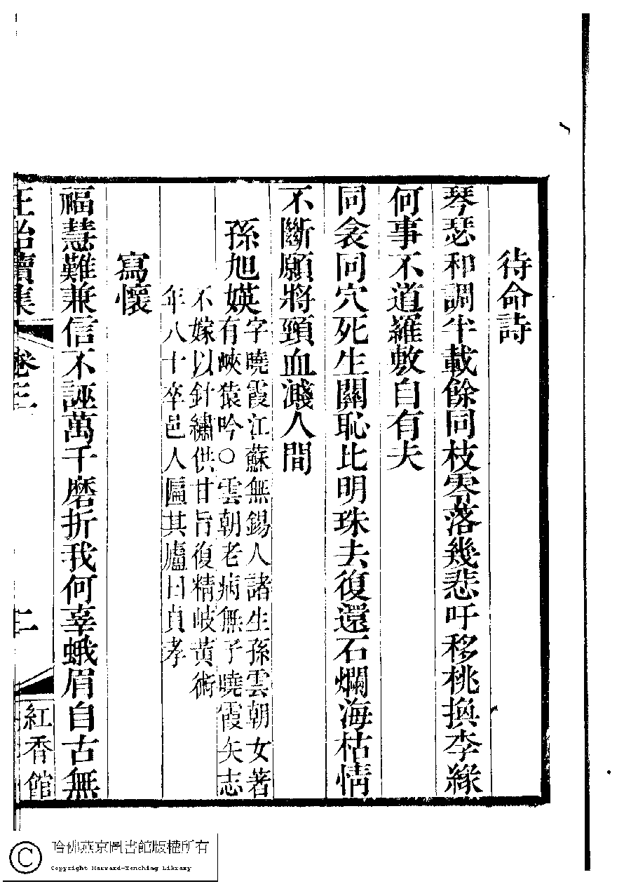 | (PRINT FRIENDLY VERSION) 國朝閨秀正始續集﹕十卷﹐附錄﹕一卷﹐補遺﹕一卷﹐輓詞﹕一卷(清惲珠輯)。清道光十六年(1836)紅香館刻本。 ![]() Page : 3.2a | click for larger image | Back |