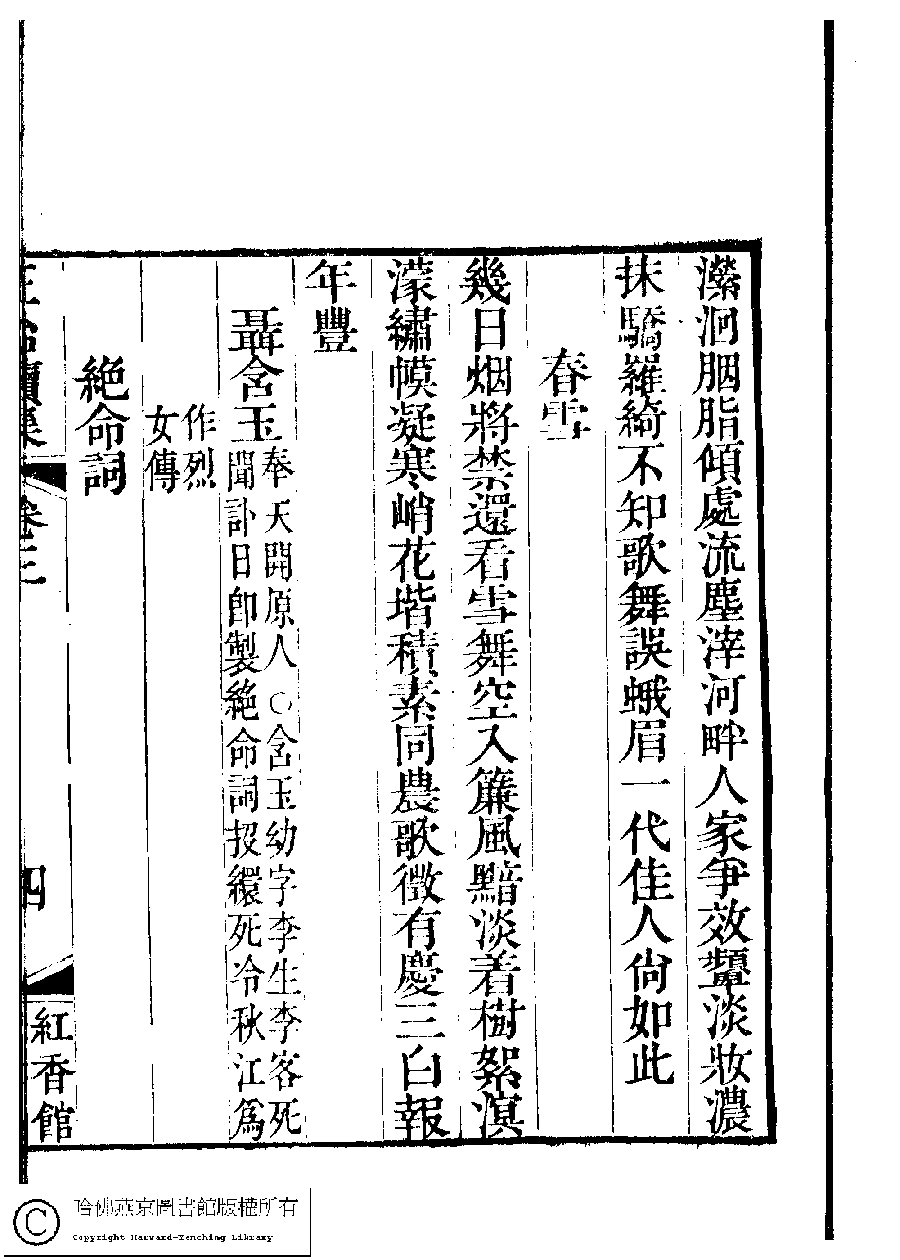 | (PRINT FRIENDLY VERSION) 國朝閨秀正始續集﹕十卷﹐附錄﹕一卷﹐補遺﹕一卷﹐輓詞﹕一卷(清惲珠輯)。清道光十六年(1836)紅香館刻本。 ![]() Page : 3.4a | click for larger image | Back |