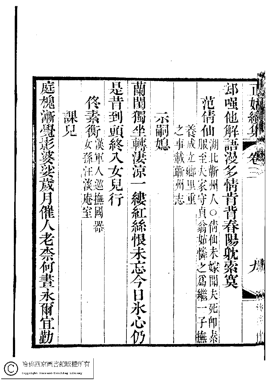 | (PRINT FRIENDLY VERSION) 國朝閨秀正始續集﹕十卷﹐附錄﹕一卷﹐補遺﹕一卷﹐輓詞﹕一卷(清惲珠輯)。清道光十六年(1836)紅香館刻本。 ![]() Page : 3.9b | click for larger image | Back |