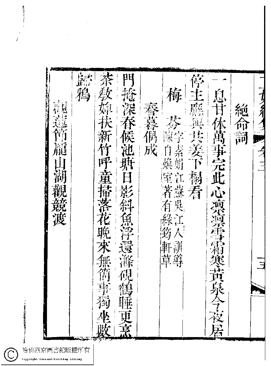 | (PRINT FRIENDLY VERSION) 國朝閨秀正始續集﹕十卷﹐附錄﹕一卷﹐補遺﹕一卷﹐輓詞﹕一卷(清惲珠輯)。清道光十六年(1836)紅香館刻本。 ![]() Page : 3.15b | click for larger image | Back |