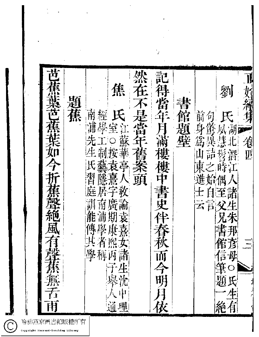 | (PRINT FRIENDLY VERSION) 國朝閨秀正始續集﹕十卷﹐附錄﹕一卷﹐補遺﹕一卷﹐輓詞﹕一卷(清惲珠輯)。清道光十六年(1836)紅香館刻本。 ![]() Page : 4.3b | click for larger image | Back |