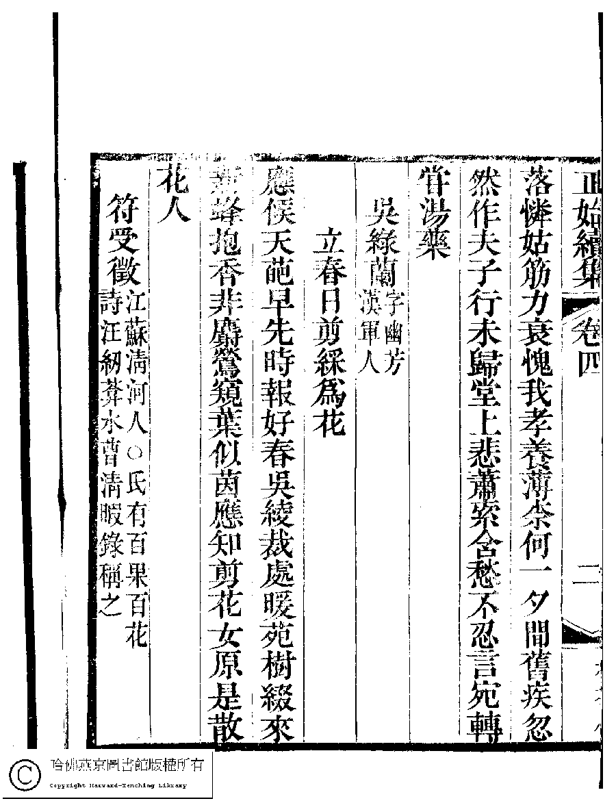 | (PRINT FRIENDLY VERSION) 國朝閨秀正始續集﹕十卷﹐附錄﹕一卷﹐補遺﹕一卷﹐輓詞﹕一卷(清惲珠輯)。清道光十六年(1836)紅香館刻本。 ![]() Page : 4.2b | click for larger image | Back |