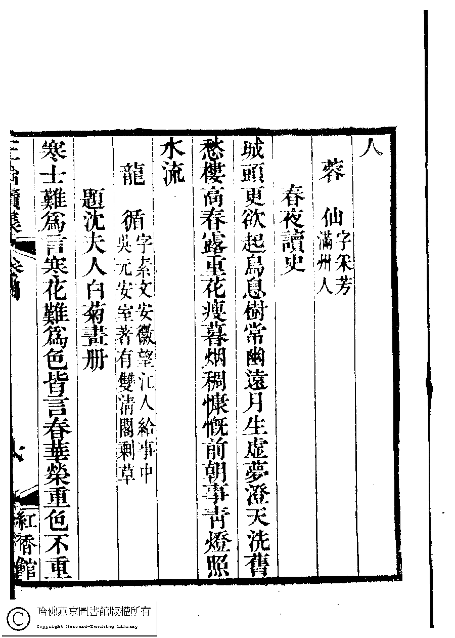 | (PRINT FRIENDLY VERSION) 國朝閨秀正始續集﹕十卷﹐附錄﹕一卷﹐補遺﹕一卷﹐輓詞﹕一卷(清惲珠輯)。清道光十六年(1836)紅香館刻本。 ![]() Page : 4.7a | click for larger image | Back |