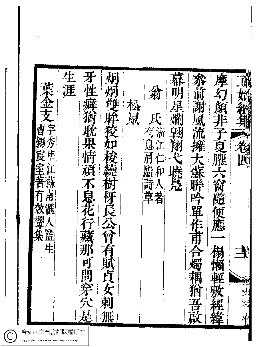 | (PRINT FRIENDLY VERSION) 國朝閨秀正始續集﹕十卷﹐附錄﹕一卷﹐補遺﹕一卷﹐輓詞﹕一卷(清惲珠輯)。清道光十六年(1836)紅香館刻本。 ![]() Page : 4.12b | click for larger image | Back |