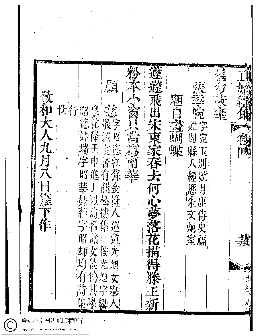 | (PRINT FRIENDLY VERSION) 國朝閨秀正始續集﹕十卷﹐附錄﹕一卷﹐補遺﹕一卷﹐輓詞﹕一卷(清惲珠輯)。清道光十六年(1836)紅香館刻本。 ![]() Page : 4.15b | click for larger image | Back |