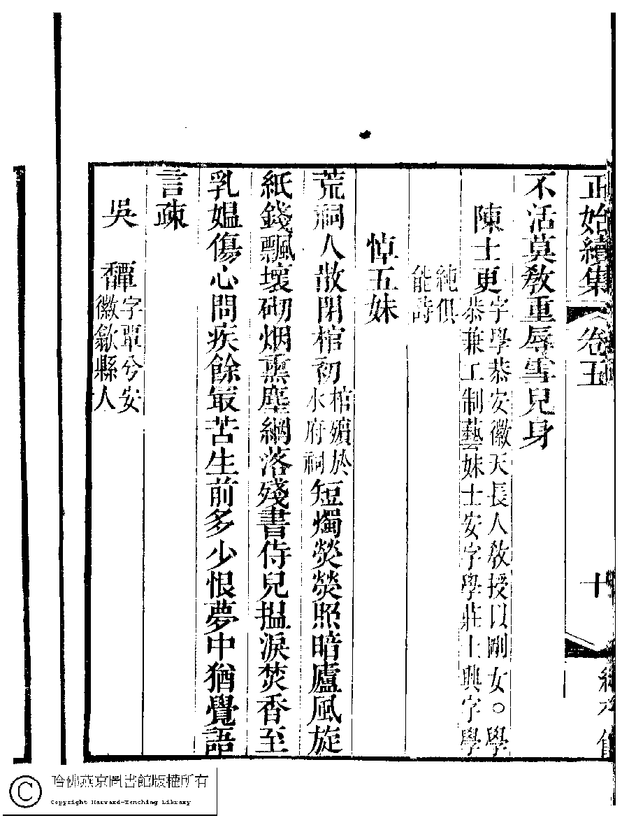 | (PRINT FRIENDLY VERSION) 國朝閨秀正始續集﹕十卷﹐附錄﹕一卷﹐補遺﹕一卷﹐輓詞﹕一卷(清惲珠輯)。清道光十六年(1836)紅香館刻本。 ![]() Page : 5.10b | click for larger image | Back |