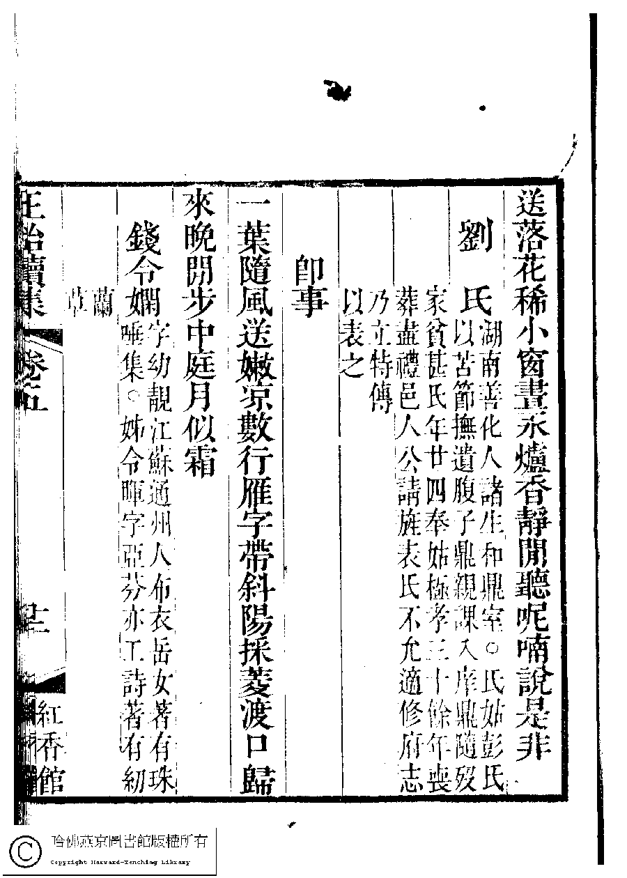 | (PRINT FRIENDLY VERSION) 國朝閨秀正始續集﹕十卷﹐附錄﹕一卷﹐補遺﹕一卷﹐輓詞﹕一卷(清惲珠輯)。清道光十六年(1836)紅香館刻本。 ![]() Page : 5.12a | click for larger image | Back |