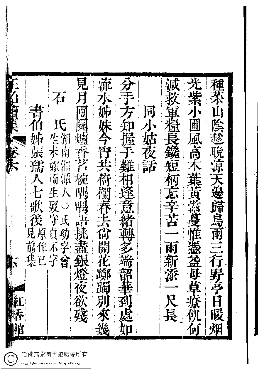 | (PRINT FRIENDLY VERSION) 國朝閨秀正始續集﹕十卷﹐附錄﹕一卷﹐補遺﹕一卷﹐輓詞﹕一卷(清惲珠輯)。清道光十六年(1836)紅香館刻本。 ![]() Page : 6.6a | click for larger image | Back |
