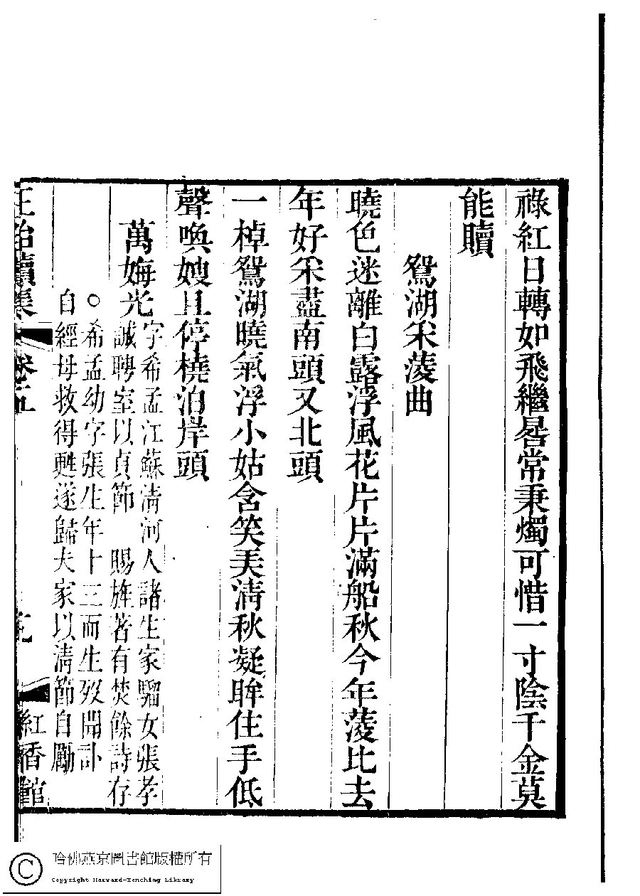 | (PRINT FRIENDLY VERSION) 國朝閨秀正始續集﹕十卷﹐附錄﹕一卷﹐補遺﹕一卷﹐輓詞﹕一卷(清惲珠輯)。清道光十六年(1836)紅香館刻本。 ![]() Page : 5.19a | click for larger image | Back |