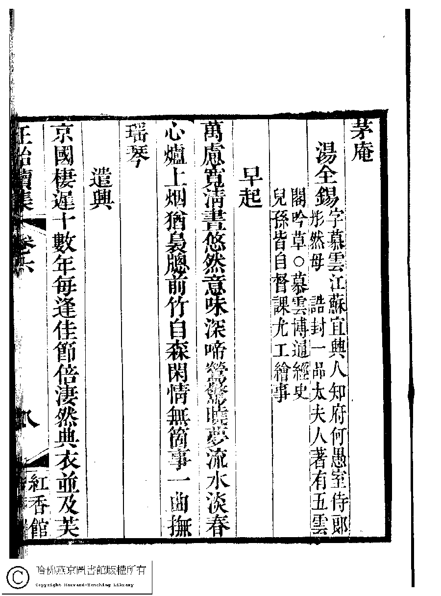 | (PRINT FRIENDLY VERSION) 國朝閨秀正始續集﹕十卷﹐附錄﹕一卷﹐補遺﹕一卷﹐輓詞﹕一卷(清惲珠輯)。清道光十六年(1836)紅香館刻本。 ![]() Page : 6.8a | click for larger image | Back |