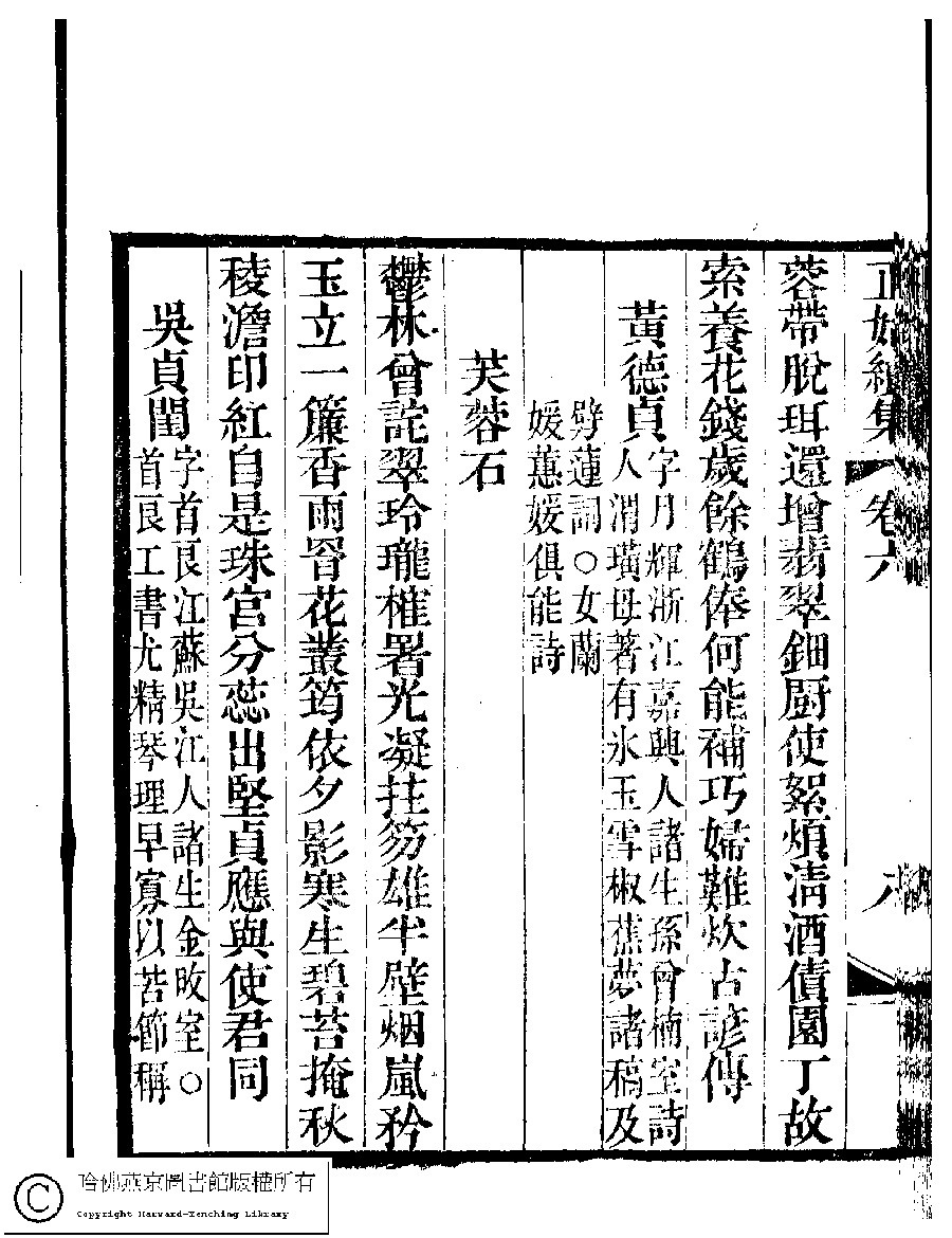 | (PRINT FRIENDLY VERSION) 國朝閨秀正始續集﹕十卷﹐附錄﹕一卷﹐補遺﹕一卷﹐輓詞﹕一卷(清惲珠輯)。清道光十六年(1836)紅香館刻本。 ![]() Page : 6.8b | click for larger image | Back |