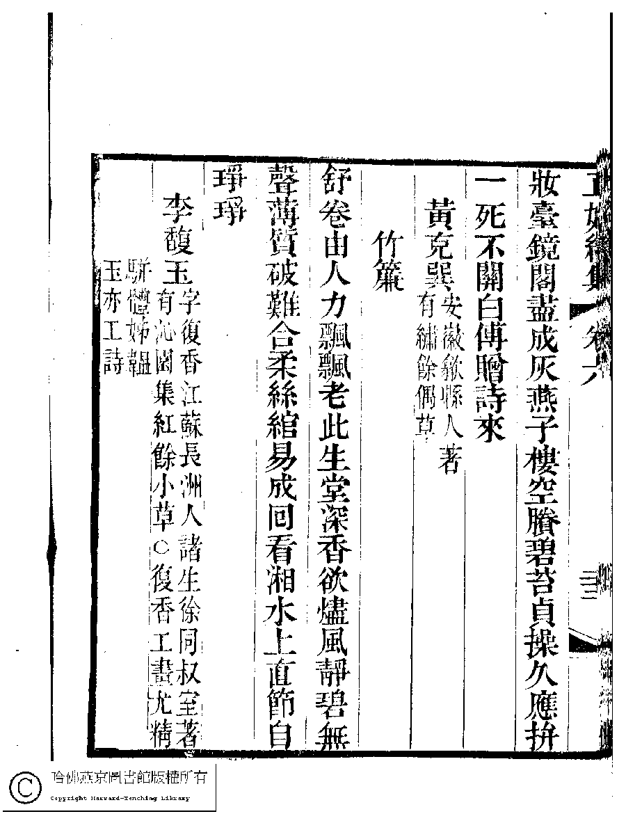 | (PRINT FRIENDLY VERSION) 國朝閨秀正始續集﹕十卷﹐附錄﹕一卷﹐補遺﹕一卷﹐輓詞﹕一卷(清惲珠輯)。清道光十六年(1836)紅香館刻本。 ![]() Page : 6.22b | click for larger image | Back |