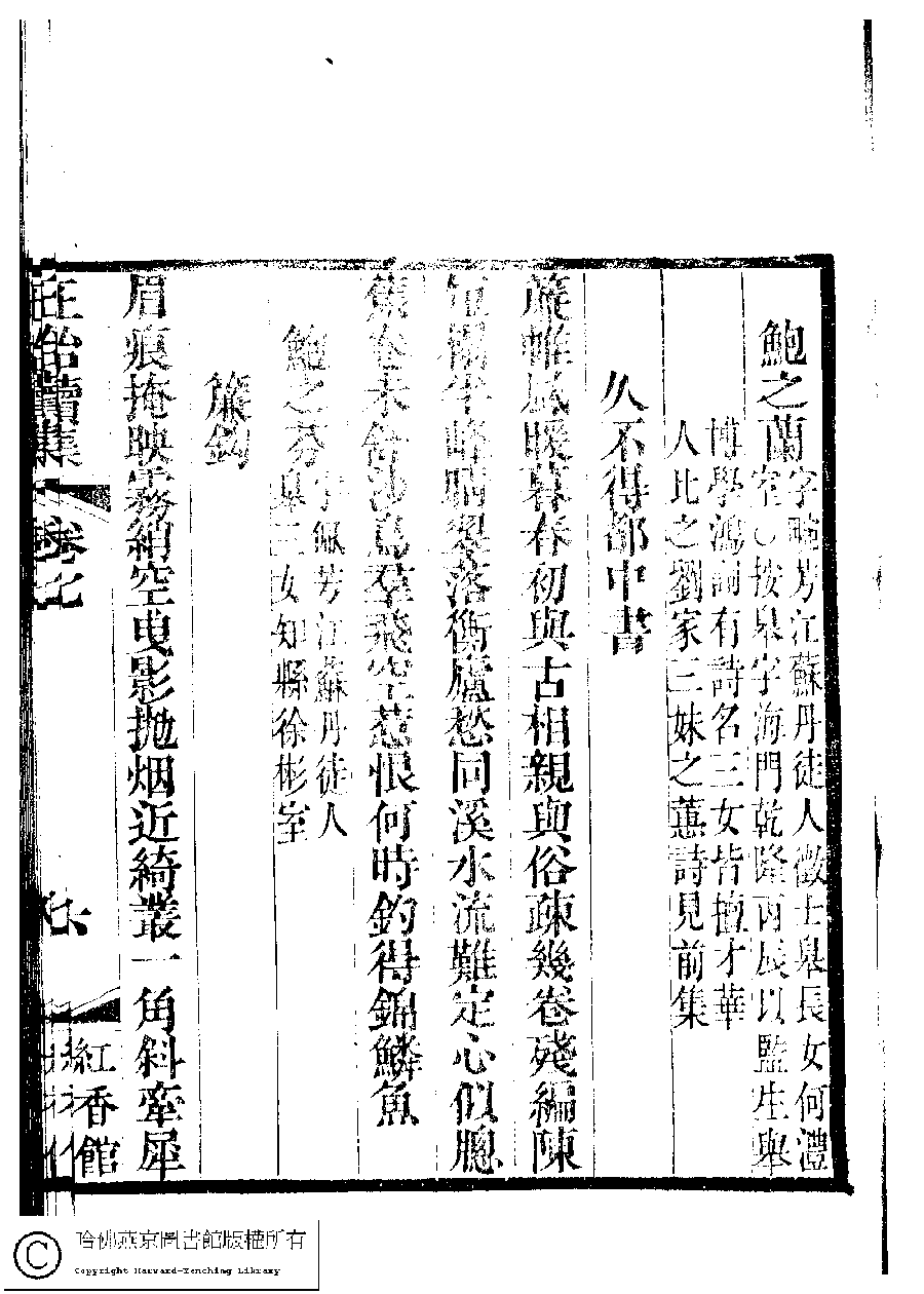 | (PRINT FRIENDLY VERSION) 國朝閨秀正始續集﹕十卷﹐附錄﹕一卷﹐補遺﹕一卷﹐輓詞﹕一卷(清惲珠輯)。清道光十六年(1836)紅香館刻本。 ![]() Page : 7.6a | click for larger image | Back |