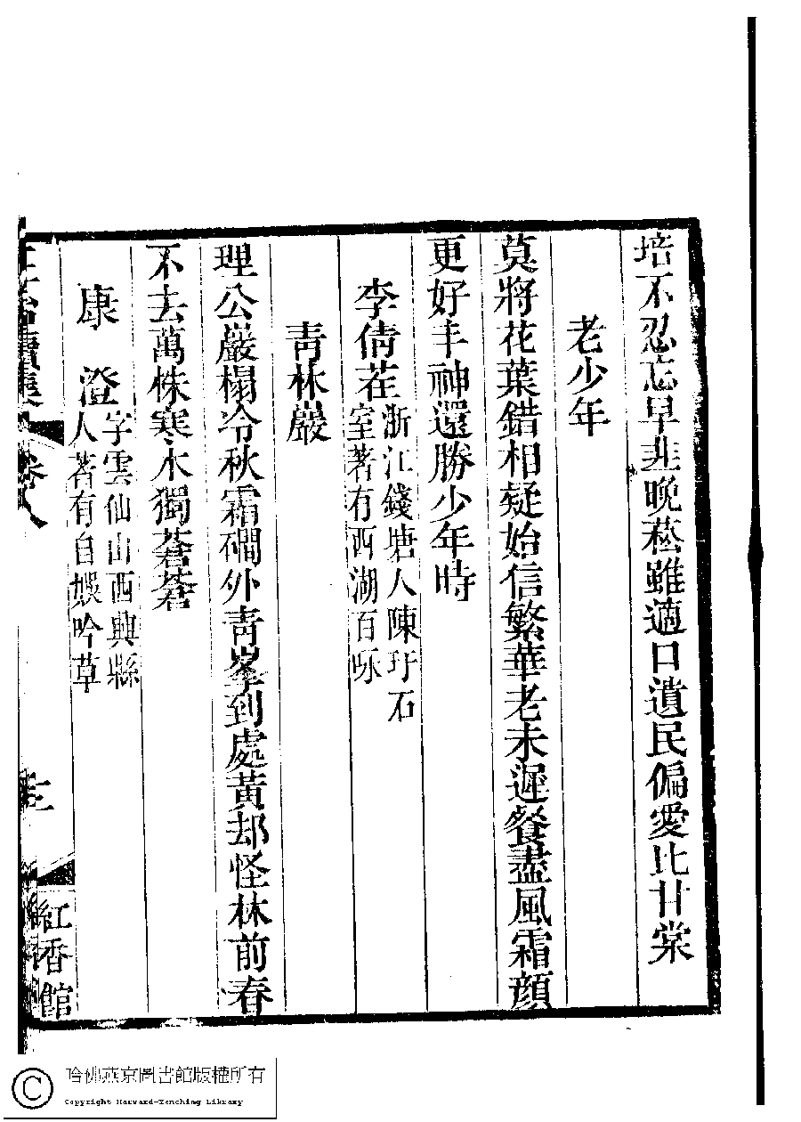 | (PRINT FRIENDLY VERSION) 國朝閨秀正始續集﹕十卷﹐附錄﹕一卷﹐補遺﹕一卷﹐輓詞﹕一卷(清惲珠輯)。清道光十六年(1836)紅香館刻本。 ![]() Page : 8.12a | click for larger image | Back |
