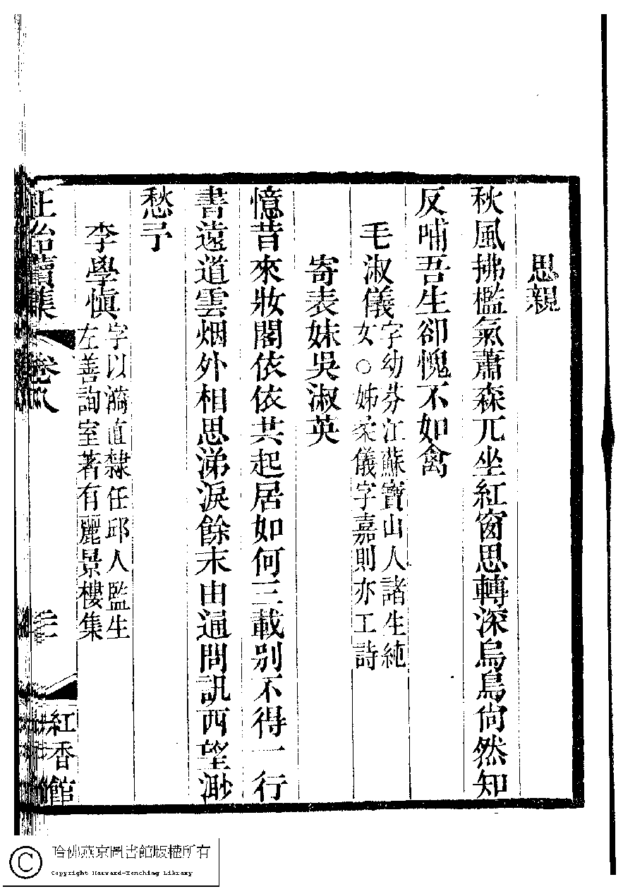 | (PRINT FRIENDLY VERSION) 國朝閨秀正始續集﹕十卷﹐附錄﹕一卷﹐補遺﹕一卷﹐輓詞﹕一卷(清惲珠輯)。清道光十六年(1836)紅香館刻本。 ![]() Page : 8.21a | click for larger image | Back |