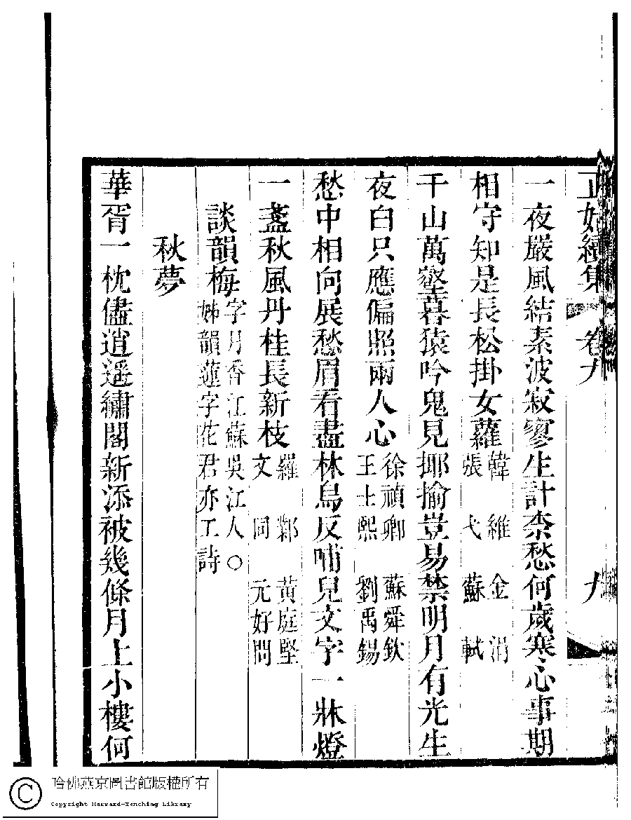 | (PRINT FRIENDLY VERSION) 國朝閨秀正始續集﹕十卷﹐附錄﹕一卷﹐補遺﹕一卷﹐輓詞﹕一卷(清惲珠輯)。清道光十六年(1836)紅香館刻本。 ![]() Page : 9.9b | click for larger image | Back |