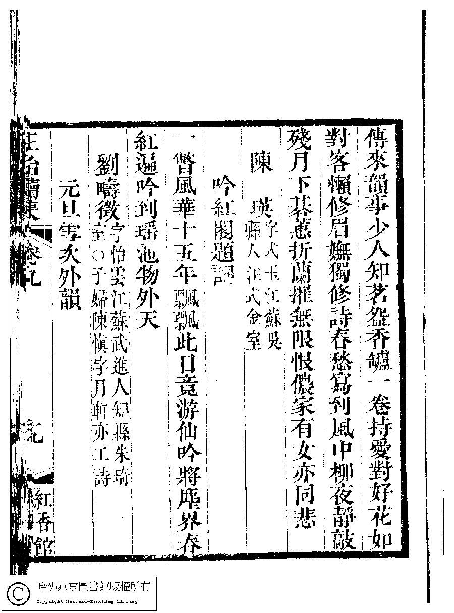 | (PRINT FRIENDLY VERSION) 國朝閨秀正始續集﹕十卷﹐附錄﹕一卷﹐補遺﹕一卷﹐輓詞﹕一卷(清惲珠輯)。清道光十六年(1836)紅香館刻本。 ![]() Page : 9.19a | click for larger image | Back |