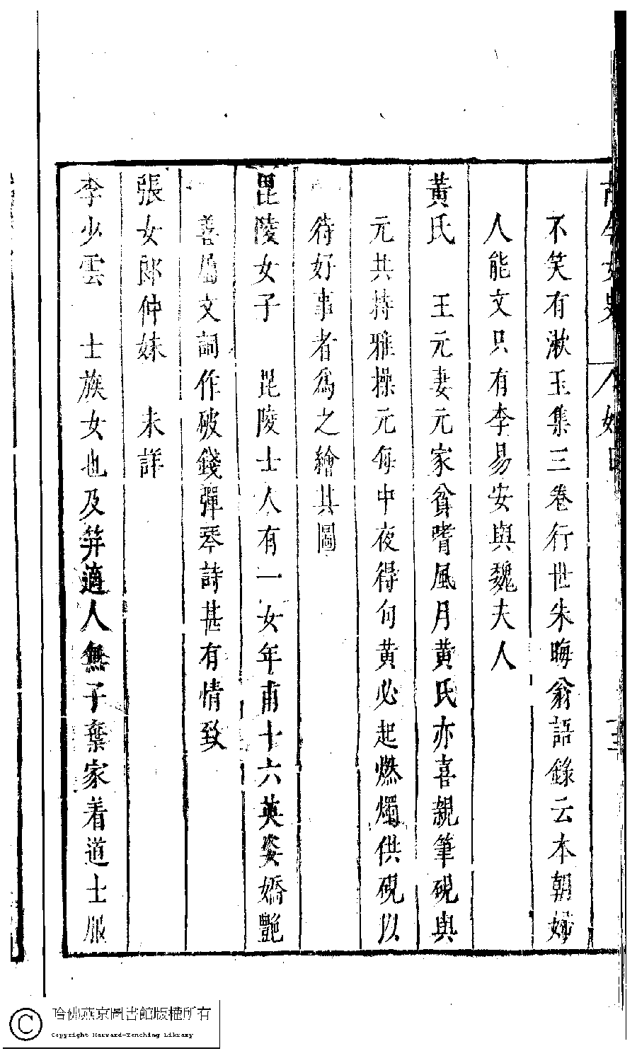 | (PRINT FRIENDLY VERSION) 古今女史﹕十二卷﹐詩集﹕八卷﹐附姓氏字里詳節﹕一卷(明趙世杰輯)。明崇禎(1628-1644)問奇閣刻本 ![]() Page : 姓氏.73b | click for larger image | Back |