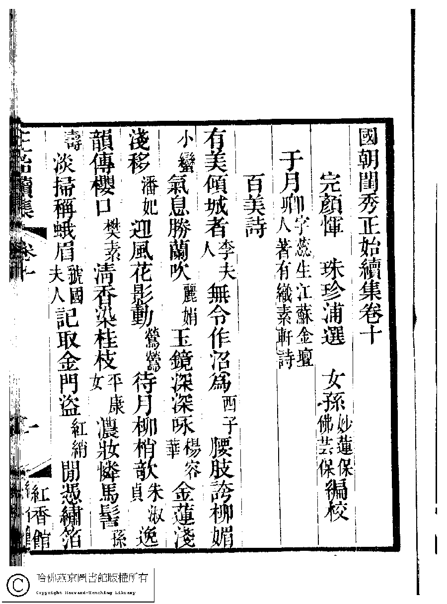 | (PRINT FRIENDLY VERSION) 國朝閨秀正始續集﹕十卷﹐附錄﹕一卷﹐補遺﹕一卷﹐輓詞﹕一卷(清惲珠輯)。清道光十六年(1836)紅香館刻本。 ![]() Page : 10.1a | click for larger image | Back |