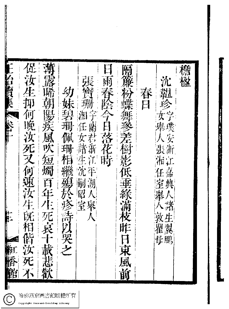| (PRINT FRIENDLY VERSION) 國朝閨秀正始續集﹕十卷﹐附錄﹕一卷﹐補遺﹕一卷﹐輓詞﹕一卷(清惲珠輯)。清道光十六年(1836)紅香館刻本。 ![]() Page : 10.12a | click for larger image | Back |