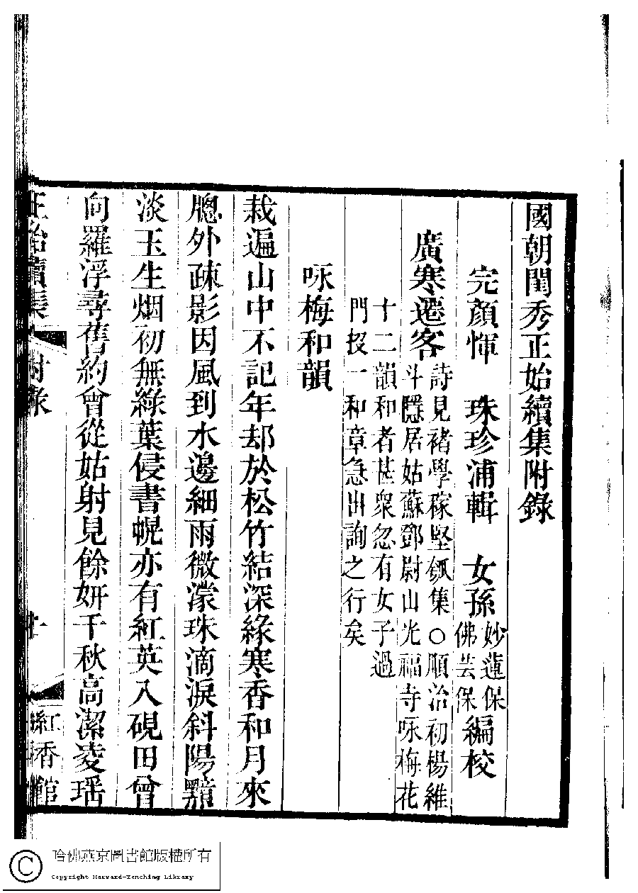 | (PRINT FRIENDLY VERSION) 國朝閨秀正始續集﹕十卷﹐附錄﹕一卷﹐補遺﹕一卷﹐輓詞﹕一卷(清惲珠輯)。清道光十六年(1836)紅香館刻本。 ![]() Page : 附錄.1a | click for larger image | Back |