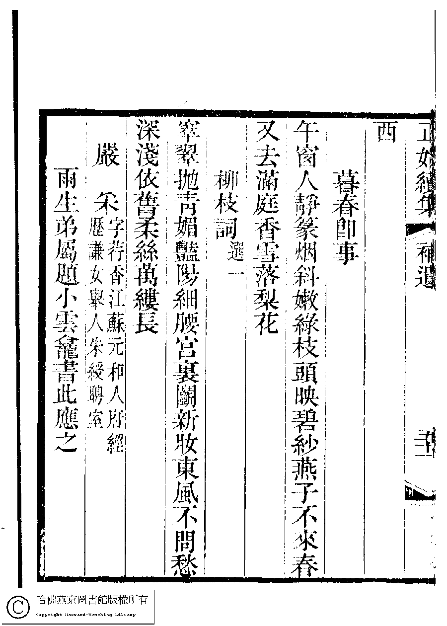 | (PRINT FRIENDLY VERSION) 國朝閨秀正始續集﹕十卷﹐附錄﹕一卷﹐補遺﹕一卷﹐輓詞﹕一卷(清惲珠輯)。清道光十六年(1836)紅香館刻本。 ![]() Page : 補遺.51b | click for larger image | Back |