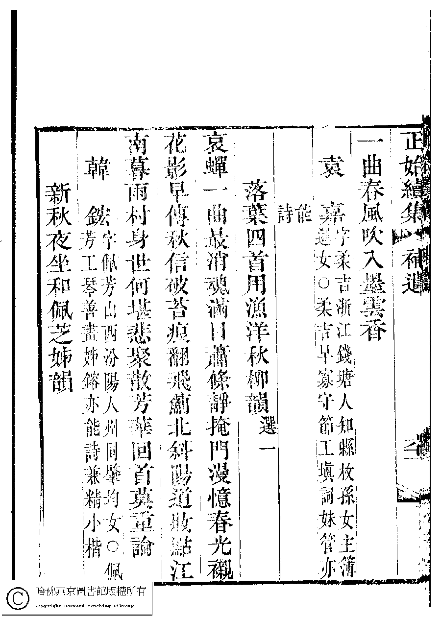| (PRINT FRIENDLY VERSION) 國朝閨秀正始續集﹕十卷﹐附錄﹕一卷﹐補遺﹕一卷﹐輓詞﹕一卷(清惲珠輯)。清道光十六年(1836)紅香館刻本。 ![]() Page : 補遺.61b | click for larger image | Back |