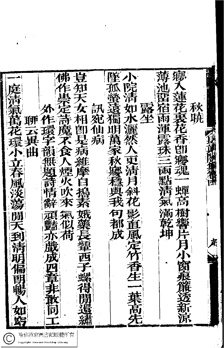 | (PRINT FRIENDLY VERSION) 長真閣集﹕七卷(清席佩蘭撰)。光緖十七年(1891)强氏南皋草廬刻本。 ![]() Page : 4.8b | click for larger image | Back |