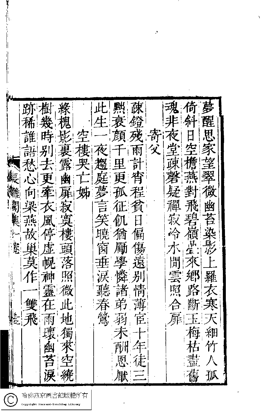 | (PRINT FRIENDLY VERSION) 長離閣集﹕一卷(清王釆薇撰)。清嘉慶二十三年(1818)刻本。 ![]() Page : 12a | click for larger image | 長離閣集﹕一卷(清王釆薇撰)。清嘉慶二十三年(1818)刻本。![]() Page : 11b | click for larger image | Back |