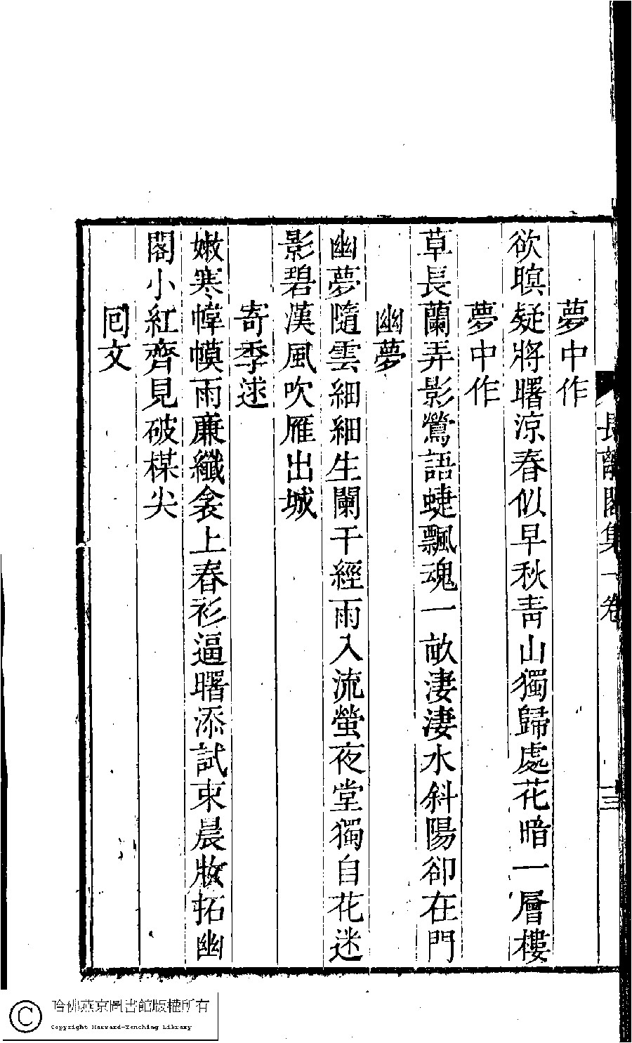 | (PRINT FRIENDLY VERSION) 長離閣集﹕一卷(清王釆薇撰)。清嘉慶二十三年(1818)刻本。 ![]() Page : 13b | click for larger image | Back |